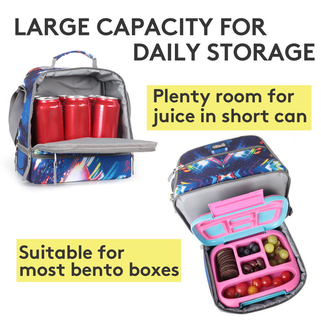 Large capacity insulated divided lunch bag. Various patterns, high quality materials. Suitable for both boys and girls.